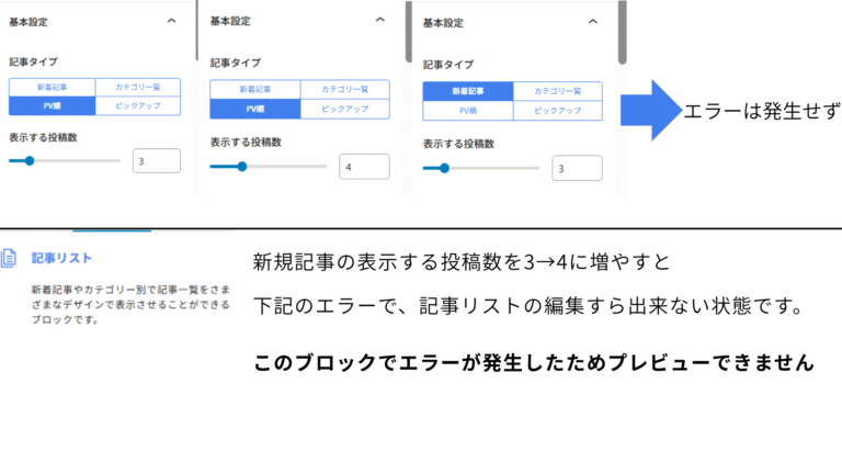 記事タイプのカテゴリー一覧、PV数、ピックアップで同様に投稿数を増やしてもエラーは発生せず、新規記事で投稿数4以上で発生している状態です。