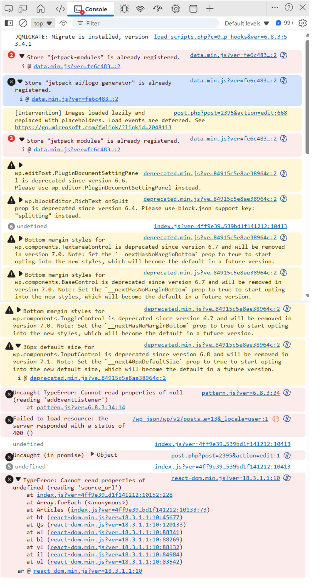 こちらのエラー内容は、ブロックエディター内で一部の通信処理がうまくいかなかった際に表示されるものです。