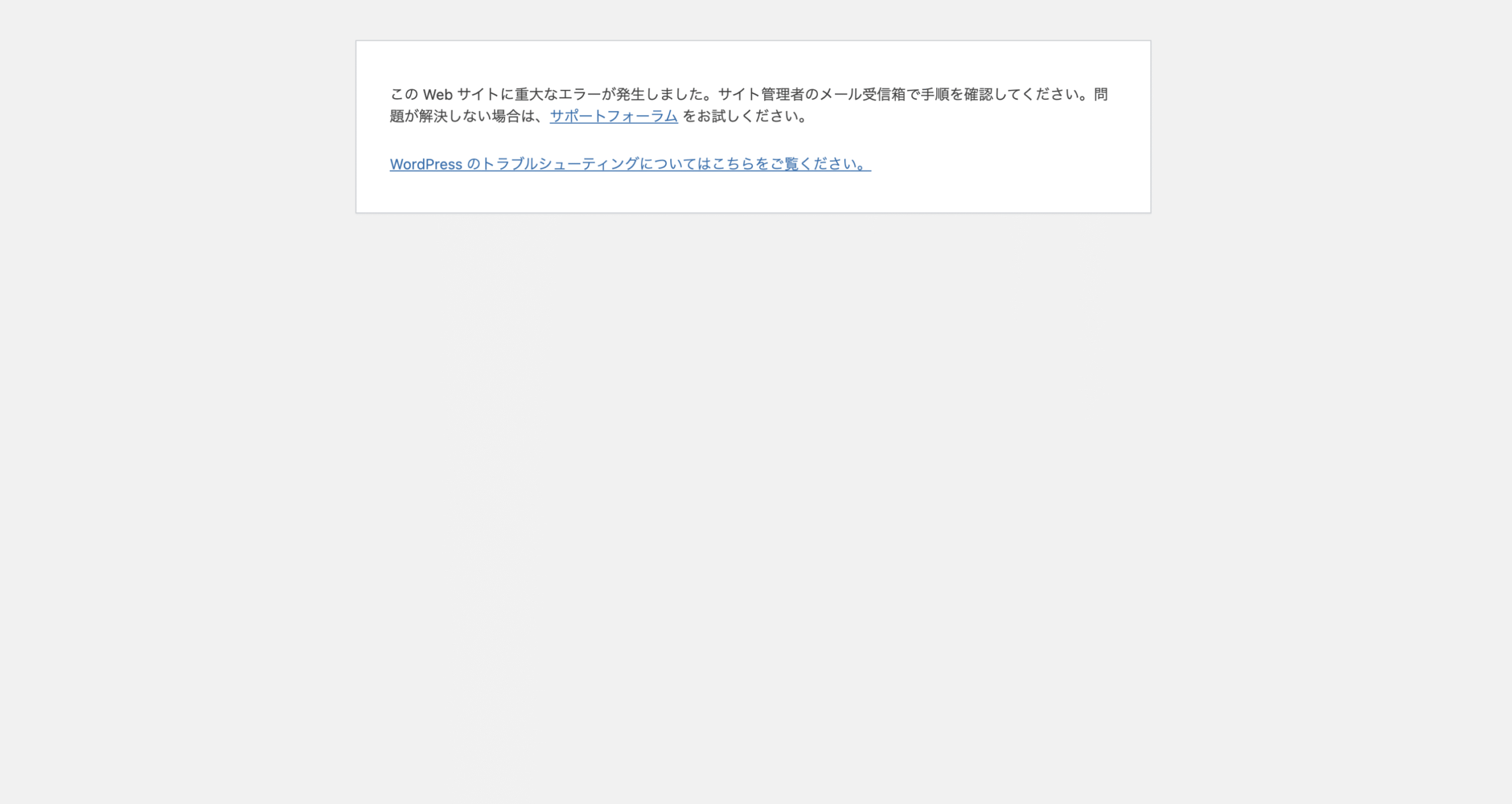この Web サイトに重大なエラーが発生しました。サイト管理者のメール受信箱で手順を確認してください。問題が解決しない場合は、サポートフォーラム をお試しください。