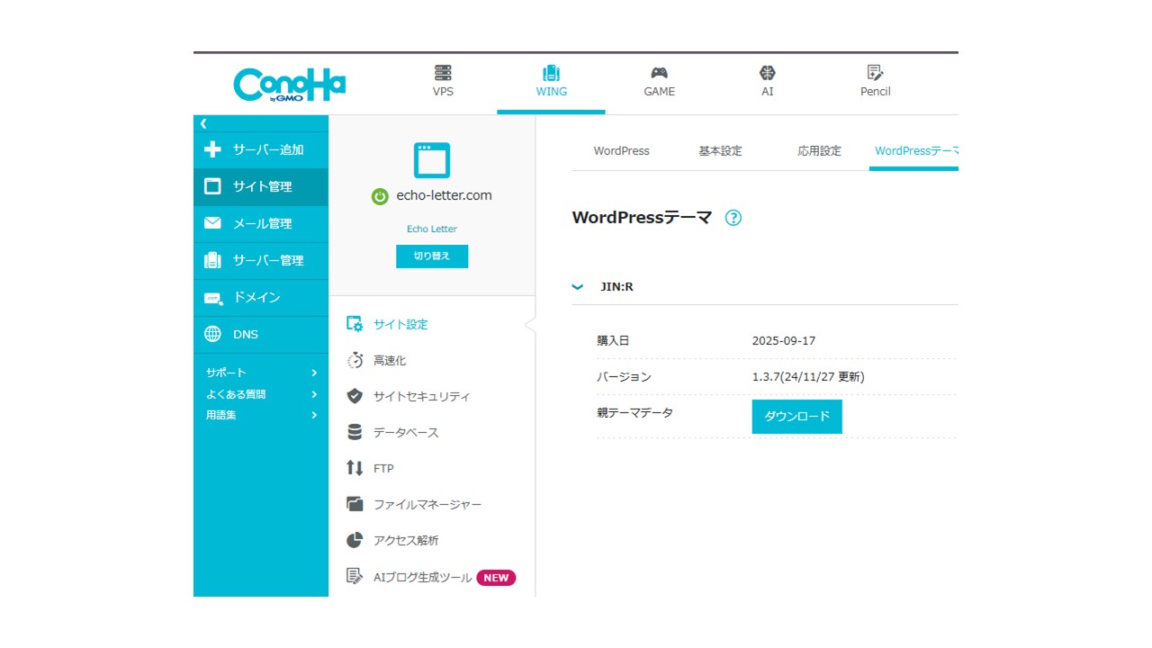●ConoHaコントロールパネル >「サイト管理」>「サイト高速化」から、WEXALを一時的にOFFにして保存。同じく「サイト高速化」画面から、コンテンツキャッシュを削除。この状態でテーマ更新画面を確認