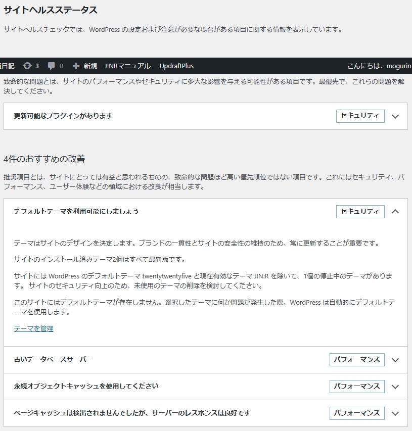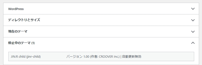 また、ダッシュボードに「デフォルトテーマを利用可能にしましょう」と出ています。停止中のテーマが1つあります。テーマを停止にした覚えはありません。これも関係があるのでしょうか?現在は、JIN:Rのみ有効になっています。テーマの所は当初より変更していません。