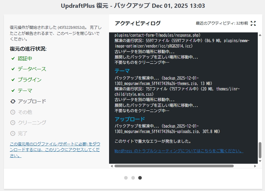 12/1に更新した際は正常だったため、12/3 → 12/2 → 12/1 のバックアップ復元を試みましたが、画像のようなエラーが出て復旧できませんでした。