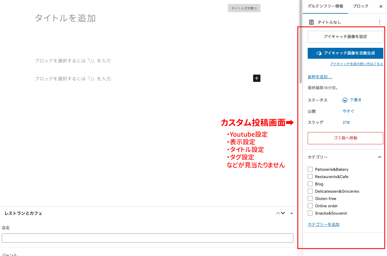 CPT UIのサポート設定はタイトル・エディター・抜粋・カスタムフィールドなどすべてチェックしています。通常の投稿では問題なくすべての設定パネルが表示されます。