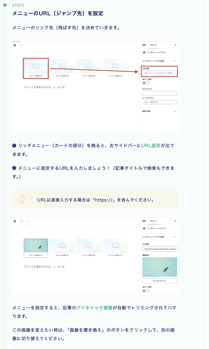添付いただいてるマニュアルの「メニューのURL(ジャンプ先)を設定」という見出しの部分が、画像設定の内容になります。