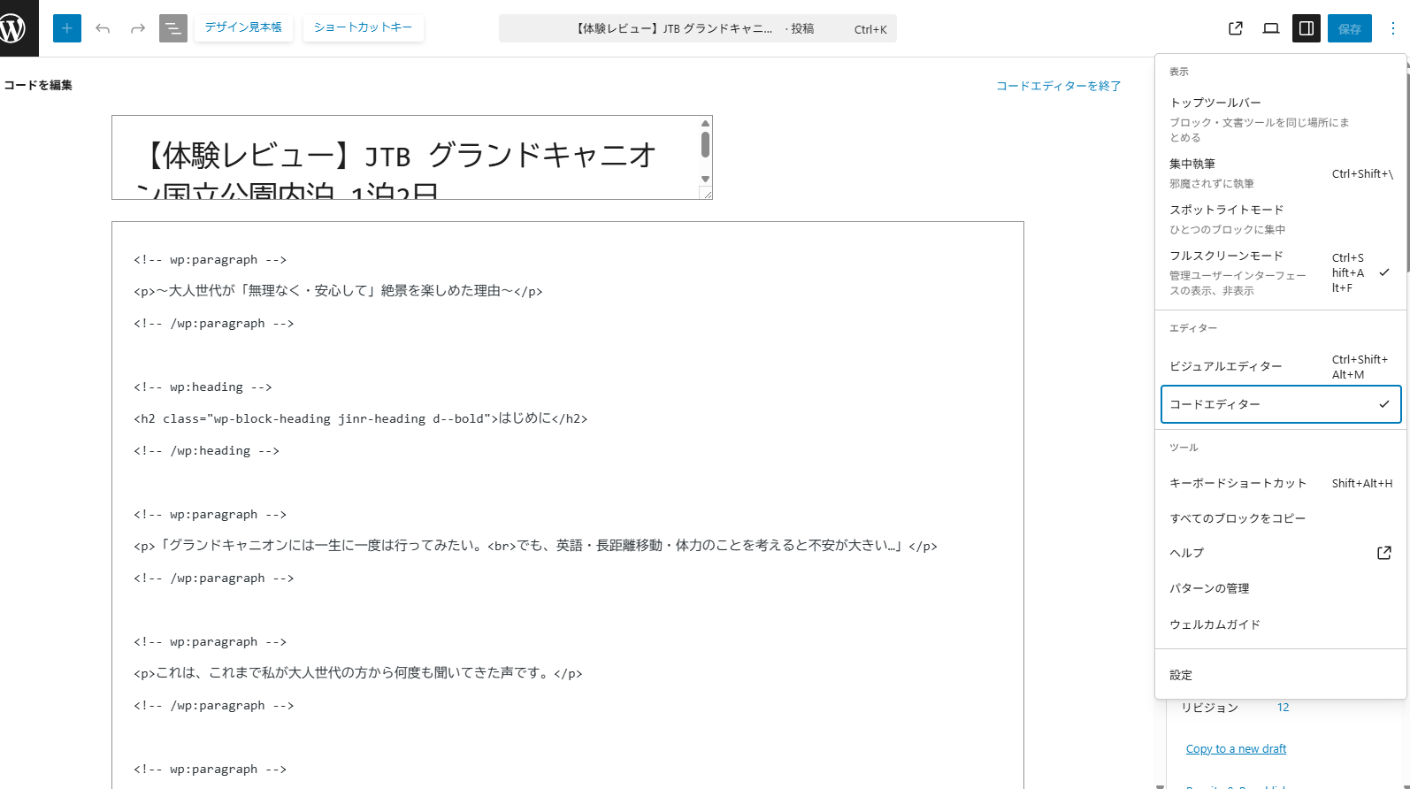 該当するJTB 3記事の本文ブロック(wp:paragraph / wp:heading)は