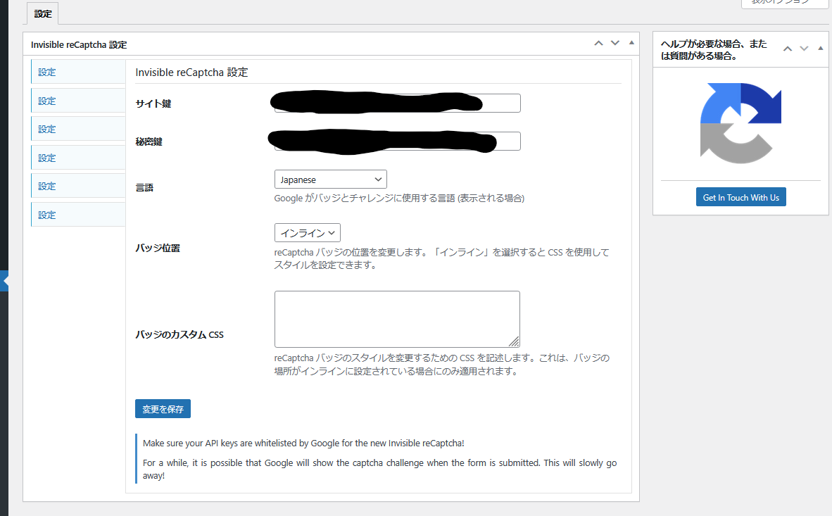 ※「Invisible reCaptcha」の設定画面も添付します(タブが「設定」しか表示されなくなっていました)