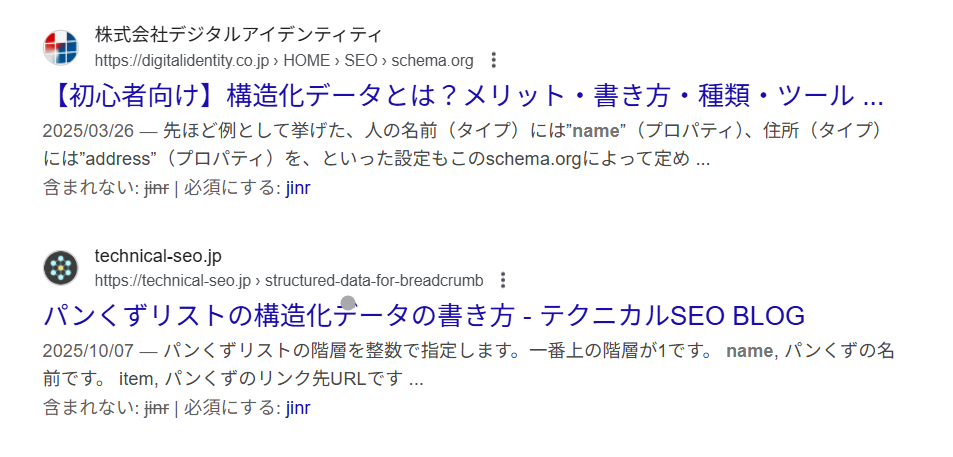 検索結果で表示される際、添付写真の上のサイトのように、リンク上にサイト名を表示させたいです。WordPressにおける「サイトタイトル」設定等は済んでいるのですが、添付画像中の下のサイトのように、リンクの上にはドメインしか表示されません。