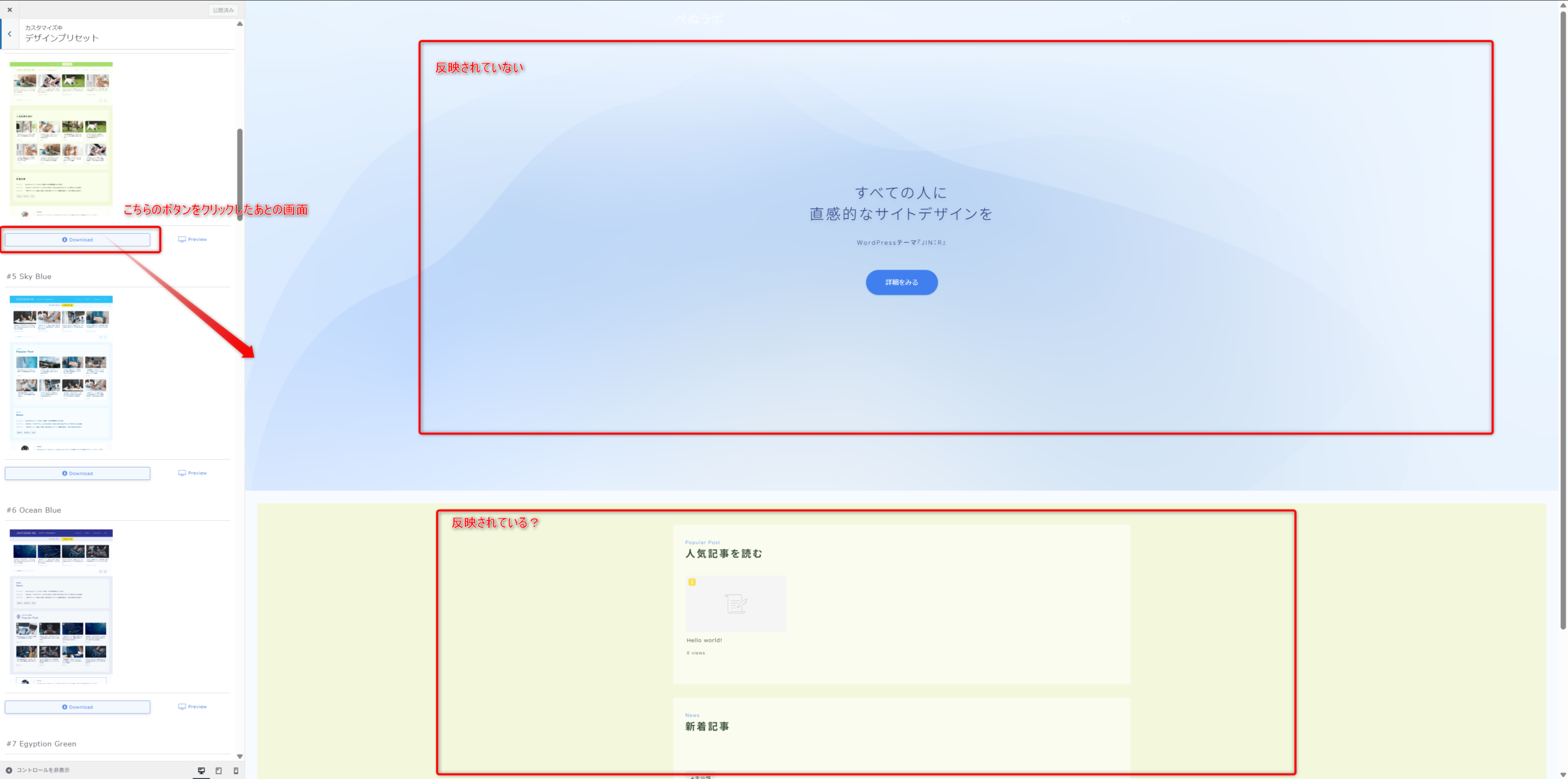 「カスタマイズ > デザインプリセット」画面でテーマをダウンロードしても、デザインが一部しか反映されません。