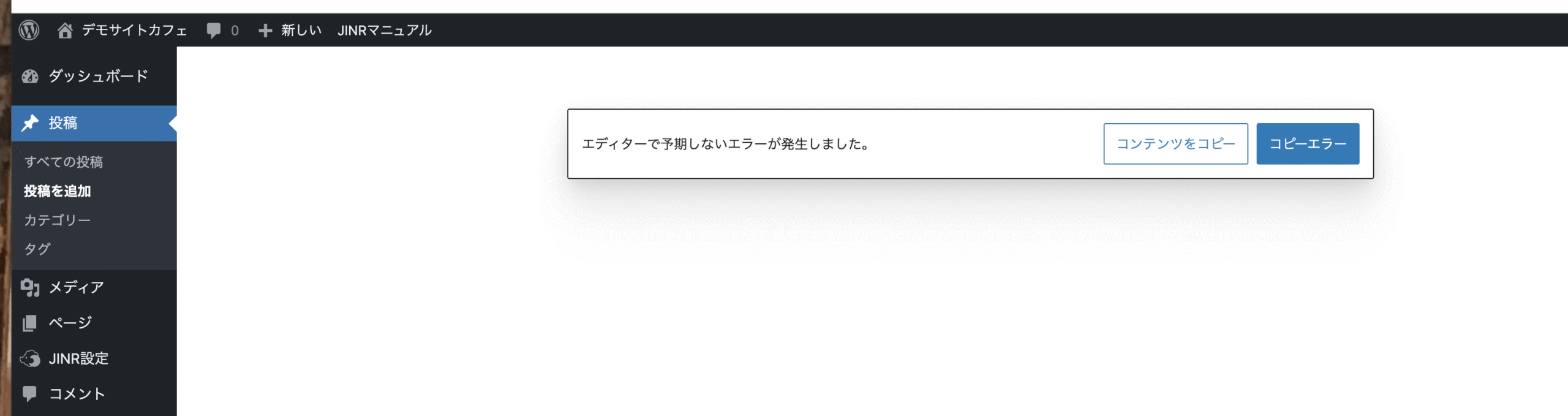 デモコンテンツをインポート既存のテーマファイルやプラグインとの競合ではなく、クリーンな環境でもJIN:Rのデモコンテンツの固定ページ編集時のみにエラーが発生してしまいます。