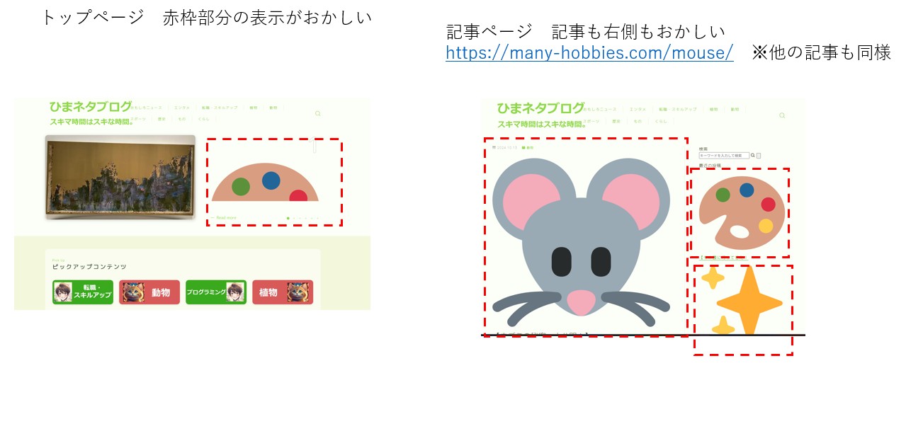 PCのサイトだけ、トップサイトや記事表示がアイコンのお化けのような状態に占拠されてしまいます。モバイルは問題なく表示されています。何が原因でしょうか?