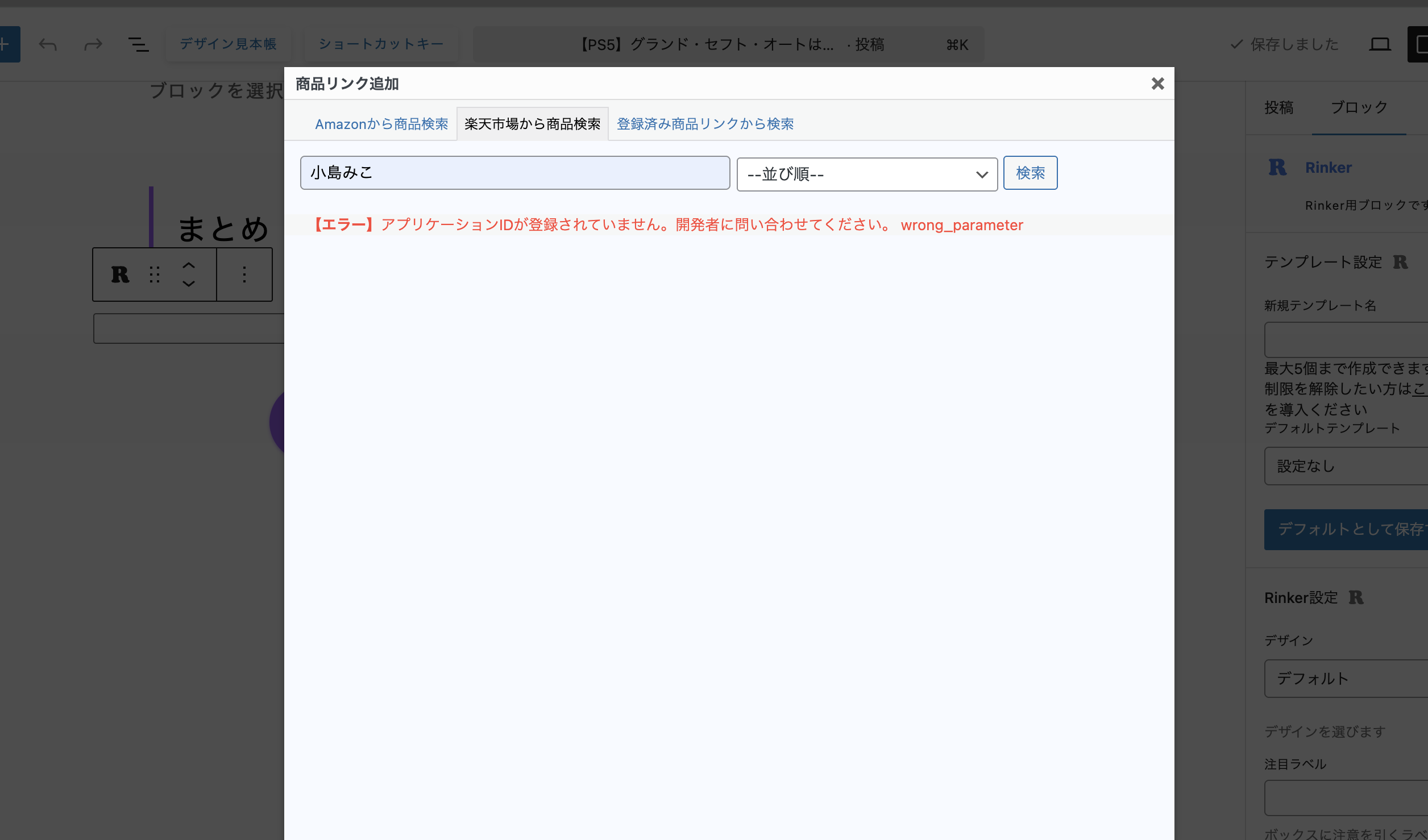 こちらで「楽天市場から商品検索」をクリックすると「アプリケーションIDが登録されていません。開発者に問い合わせてください。」と表示されました。