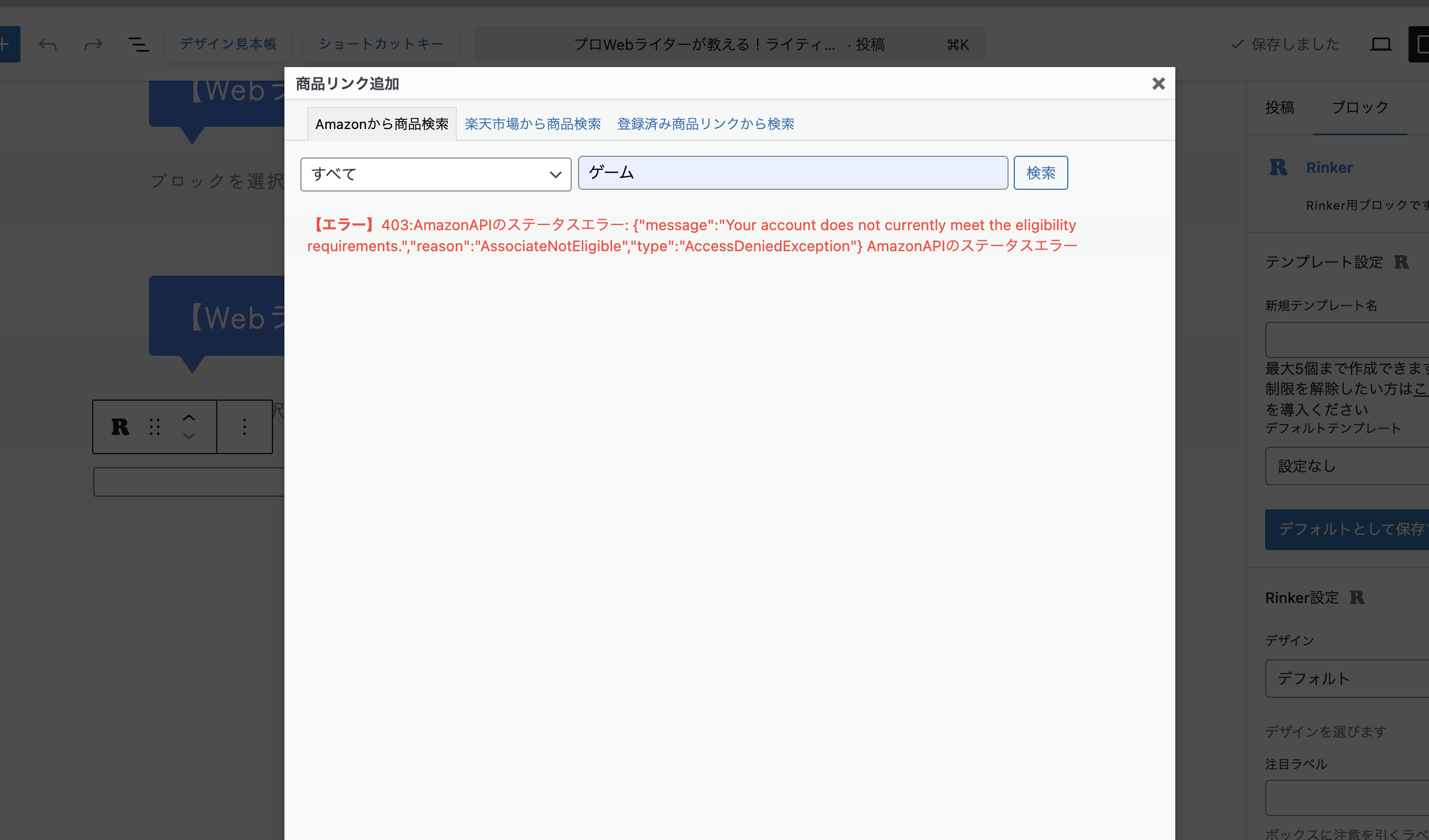 まず1つ目に運営しているブログサイトについて、こちらは「Amazonから商品検索」をクリックすると「403:AmazonAPIのステータスエラー」が表示されます。