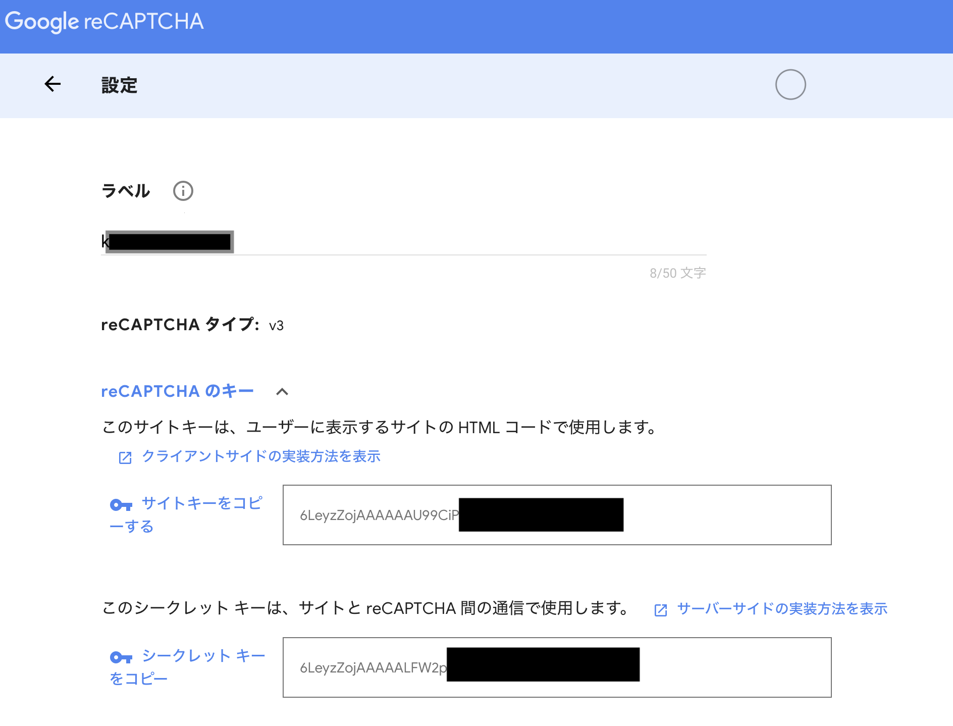 その時にre CAPTCHAをいじった記憶がないのですが、先ほど確認をしたらre CAPTCHAタイプ:v3でサイト登録やサイトキー、シークレットキーが取得されている状態?になっていました。